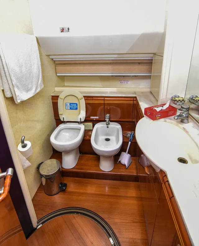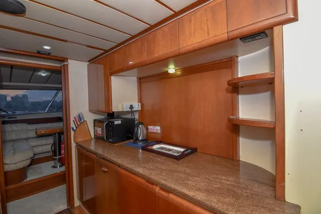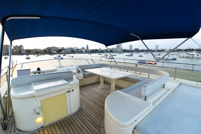 The kitchen is fully furnished with a fridge, oven and a microwave along with cooking facility, basic crockery, cutlery, glasses on board. The yacht has a spacious upper deck (fly bridge) with seating capacity for a 15 – 20 guest, covered with a canopy and tables in the center along with cushioned sofa seating, the view from the upper deck is breath taking and gives u a complete dimension of the Mumbai harbour due to its height.