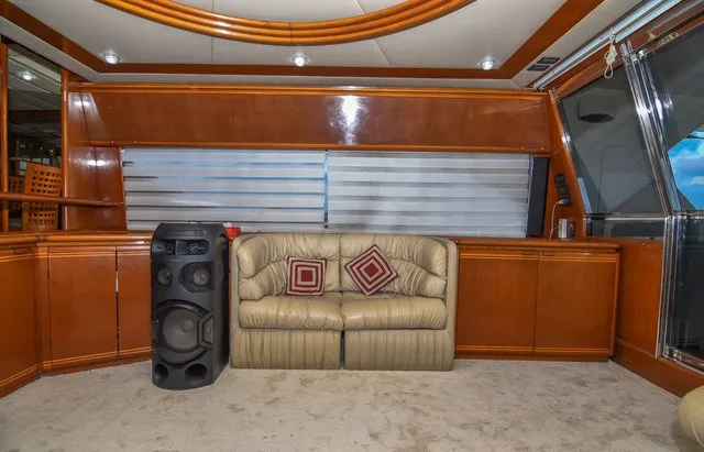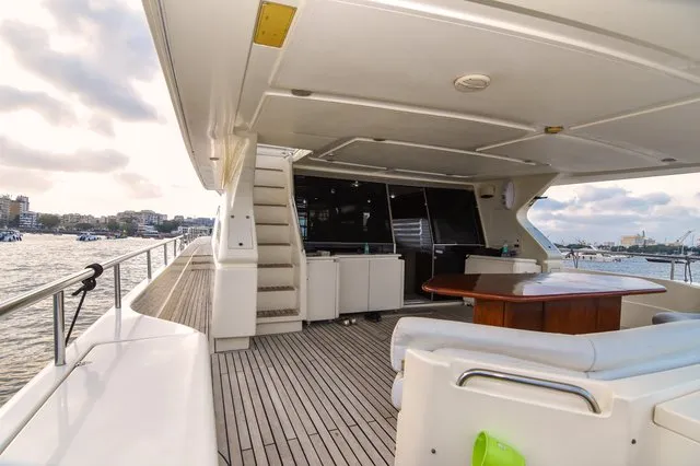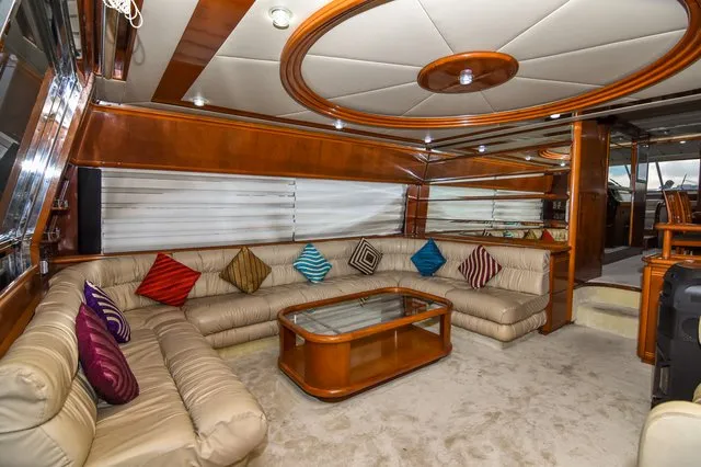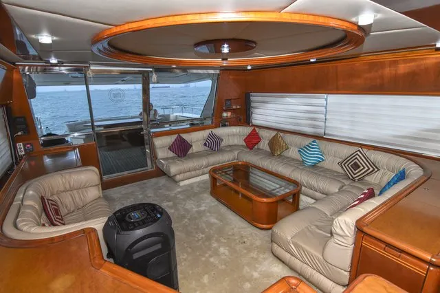 The wooden flooring helps you to balance and move comfortably on the entire yacht, the rear deck can fit another 10-15 people at a time, the rear deck is the single entrance to the interiors of the yacht which starts from a Ac saloon area with soft cushioned leather seats, wooden consoles moving into a 8 seater dining area.