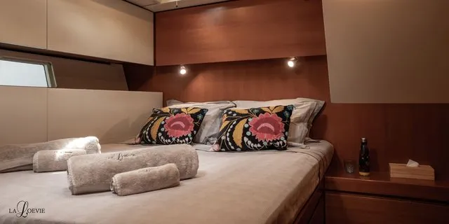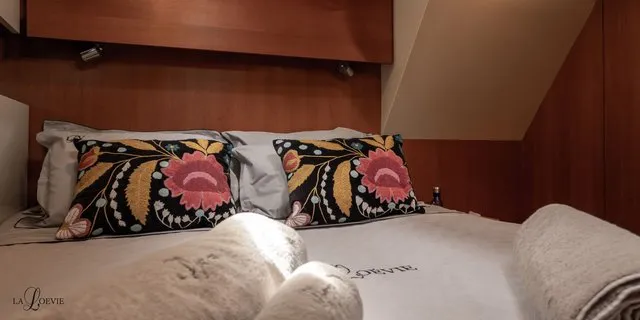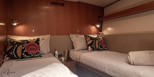 The lavish interior of LA LOÉVIE features 3 ensuite cabins for up to 6 guests. From the warm teak wood finishes to the state-of-the-art heating and air conditioning, each detail has been crafted to ensure a deluxe sailing experience. Perfect for those seeking a grand charter, LA LOÉVIE embodies the epitome of Italian elegance at its finest. With the addition of a dedicated professional crew of 3, guests aboard LA LOÉVIE can expect to be pampered and attended to with impeccable service throughout their charter.
