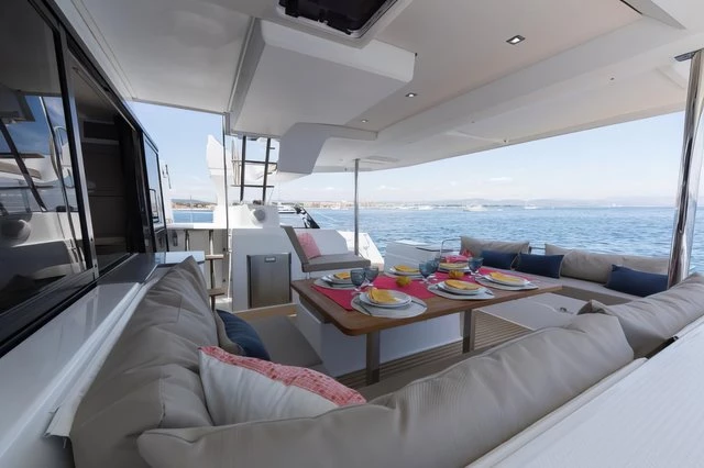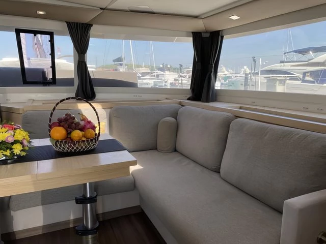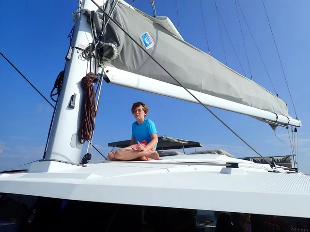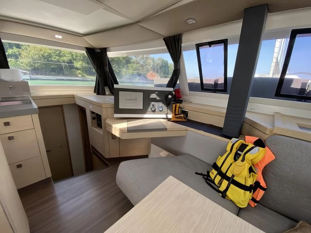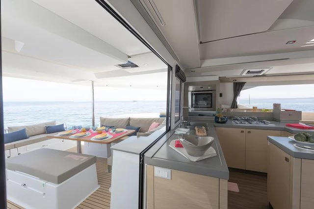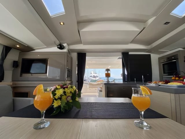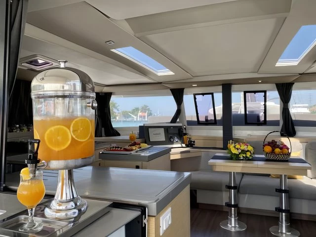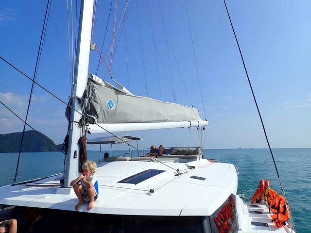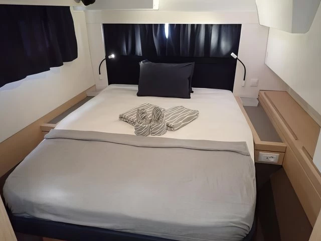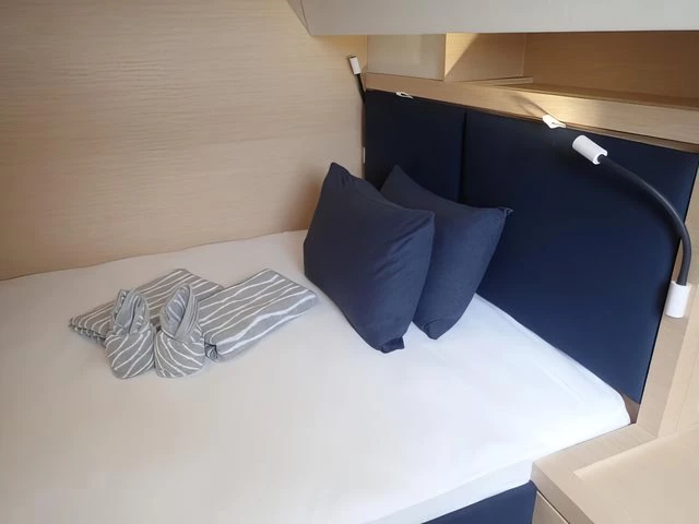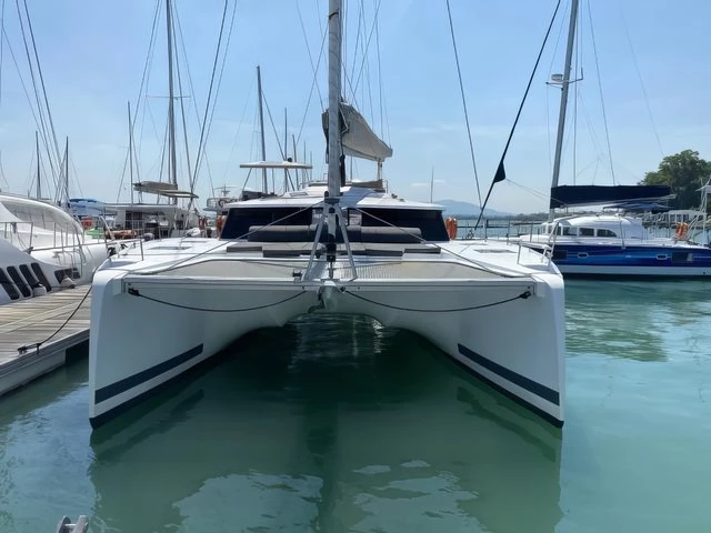 The Saona 47, Lola 2, is the only one of her kind in Asia, the latest addition to our fleet from the world- renowned yacht builder, Fountain Pajot. Lola 2 offers sleeping for 12 persons max (10 + 2) in 4 double cabins, 1 bunk bed style cabin for 2 persons and an additional drop-down bed in the saloon for 2 extra people. The galley, which is located around the saloon area, is fitted with a large double fridge compartment, a standalone freezer, microwave as well as a gas hob and oven, making cooking on board a real social event. Steps from the saloon on the starboard side hull lead to 2 double cabins with ensuite bathrooms. The port side hull has one double cabin and one twin cabin. Each cabin has its own bathroom and shower. There is air conditioning throughout the boat as well as additional fans to keep you cool in the warm tropical nights. Out on deck, Lola 2 has a very spacious living / dining area including a BBQ, a drinks chiller and a bluetooth surround sound system to listen to music of your choice. There is also a self-contained double cabin with access from the aft of the boat, again this cabin has its own bathroom facilities and air conditioning. The helm position offers a fantastic 360° view. Electric winches, halyards and sheets are all located at the helm, making this an easy boat to sail if you are shorthanded on experienced crew. Other features on deck include: – Dinghy davits, 15hp outboard motor on the dinghy, large sun deck area on the flybridge, double wide trampoline at the bow, deck showers to rinse off after a swim in the ocean and a fully battened mainsail and furling Genoa. Note The generators are needed to use air conditioning, water maker, microwave, and any other heavy usage 220 Volt appliance. All generators have an hour counter which will be registered in the inventory upon check in. Each hour of usage will be charged at 5 Euros upon check out