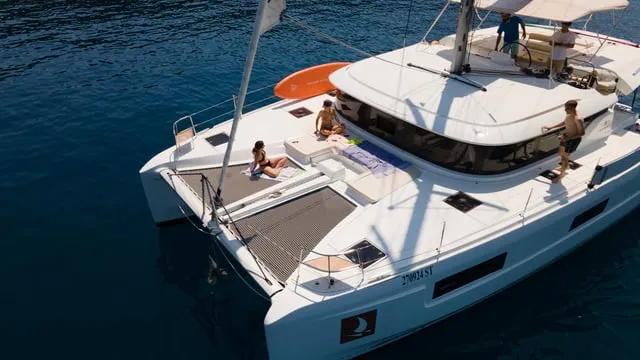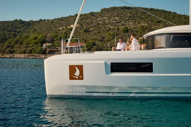 Lagoon 46 “Luna” , offered by Cata Sailing, is one of the new Lagoon 46 for charter in the Adriatic sea. After great success of Lagoon 450, the new Lagoon 46 offers even more space, comfort and great sailing fun. This model reinforces the fundamentals that have made the brand a hedonist and generous sailing reference. In addition freedom and audacity, gentle lifestyle and innovation are only some of the many beliefs that are expressed in a style of this yacht. With its double access, the Fly bridge is dedicated both to maneuvering and relaxing. The centered helm station offers protection and visibility.