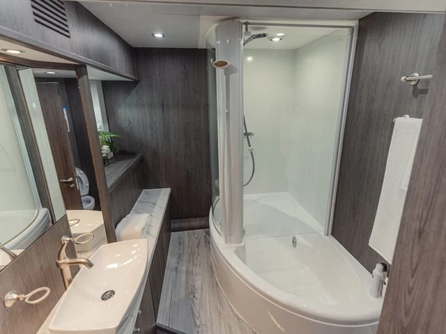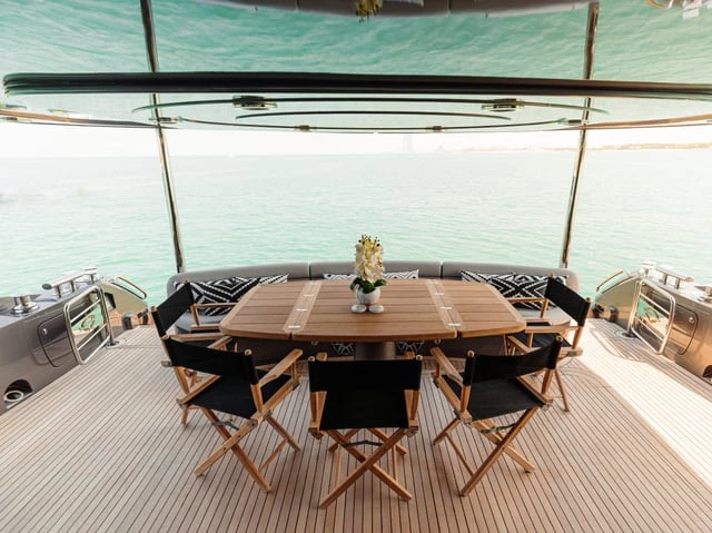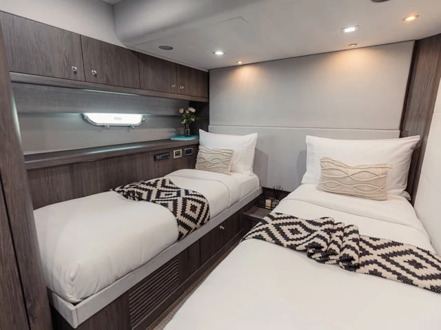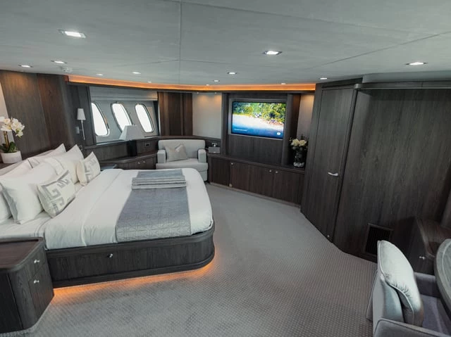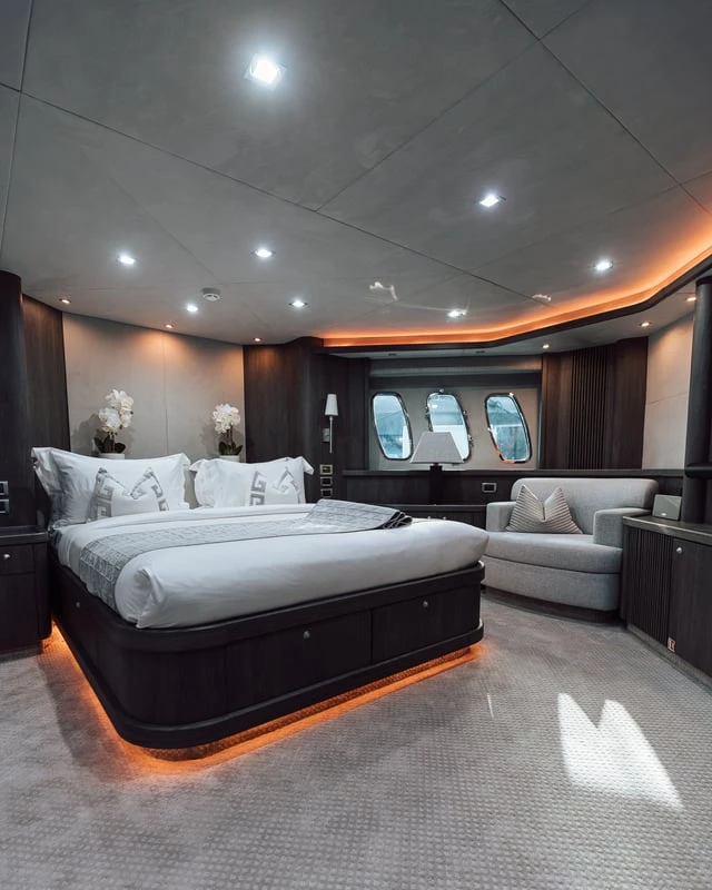 The yacht features expansive living spaces, including a stylish lounge, a refined dining area, and a spacious outdoor deck for alfresco enjoyment. Accommodating up to 30 guests for day charters and 8 overnight, Matrix includes a luxurious master suite with a king-size bed and spa-like ensuite, along with VIP and double cabins, each with private baths. A fully stocked kitchen, bar, and state-of-the-art entertainment systems ensure every detail of your experience is catered for.