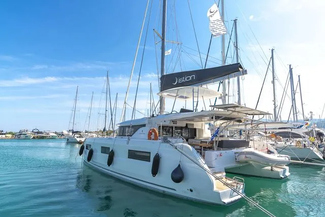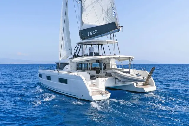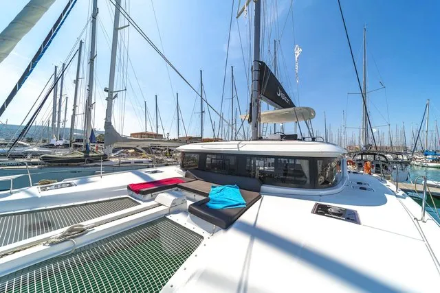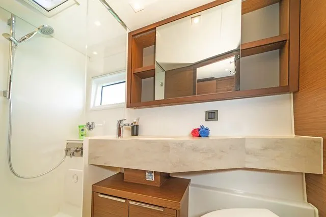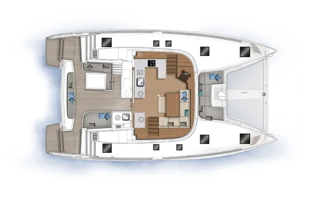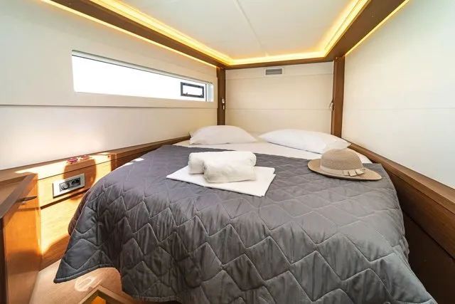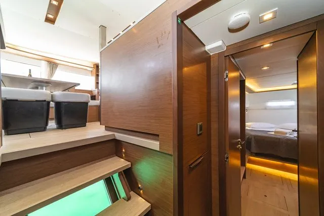 The feel at the helm is gentle, and you feel the fact that the sails have been brought aft because it tends to head up. It is an excellent feeling, not least because it is on the flybridge and the helm is centrally positioned. Visibility, both forwards and to the side, is always excellent.