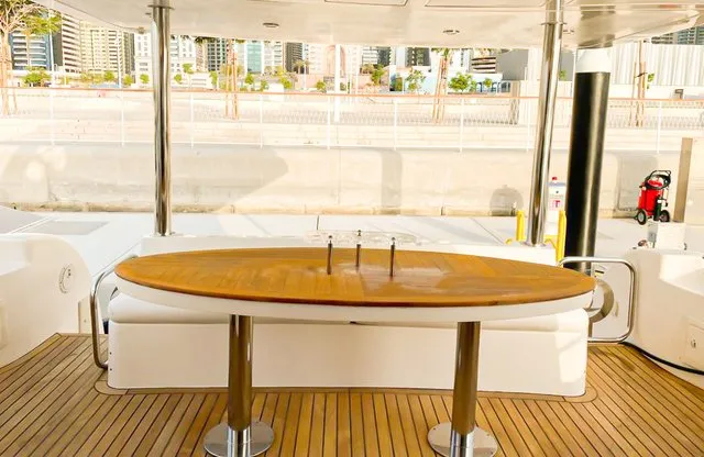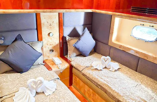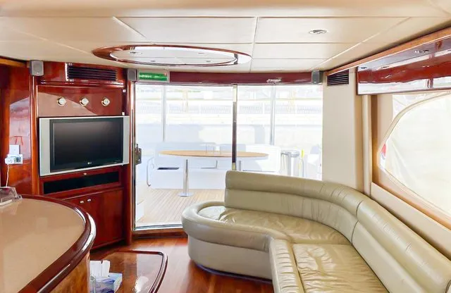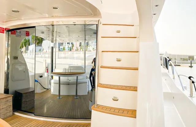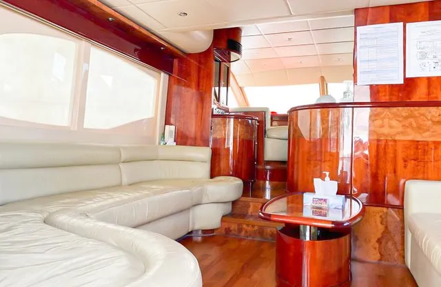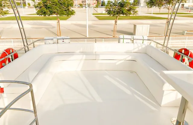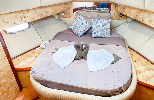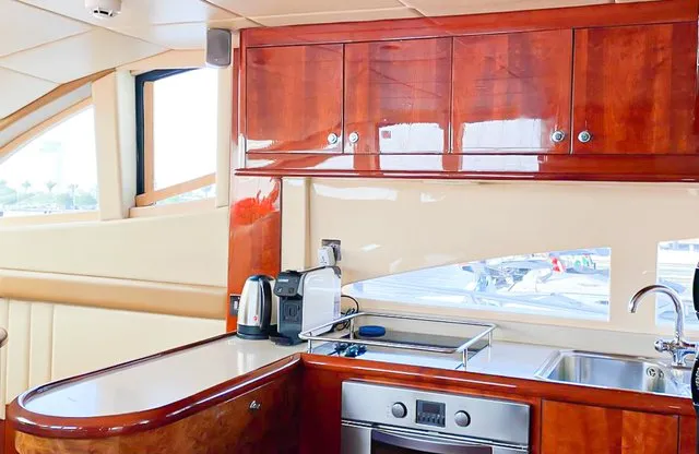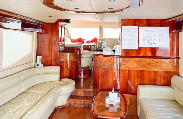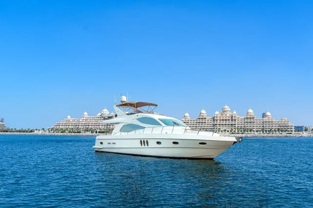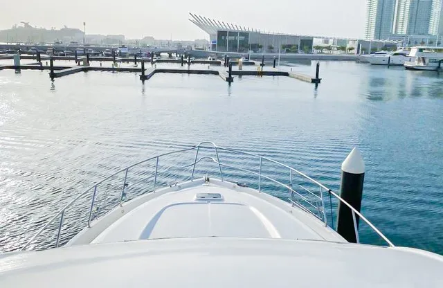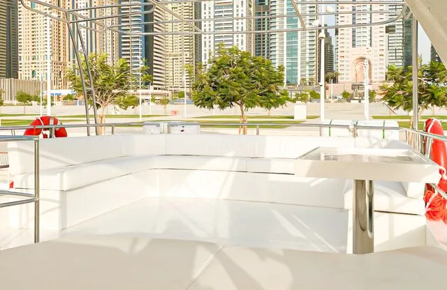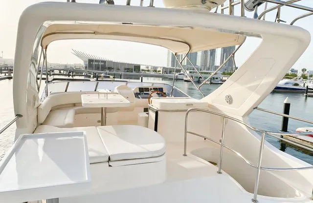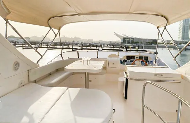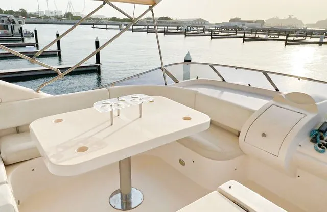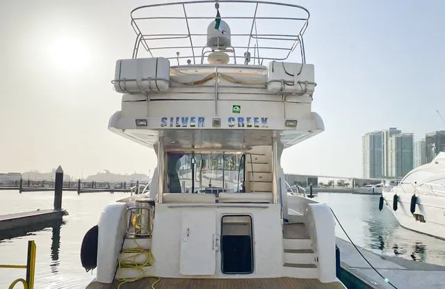 Cruise the magical waters of Dubai on a luxury boat 61 Ft Silvercreek. Sporting its features in a retro style, very sophisticated and impressive speed. She is available for charter at Dubai Harbour Marina for up to 30 guests and cruises smoothly at 26 knots. A team of 3 highly-attentive staff; one captain and two crew members will ensure an outstanding service for your boat trip. Promising nothing less than stunning, the main deck opens up with a large sliding door with an opulent saloon. A beautiful blend of luxuries and wood structural details flow from one door to the next creating a warming ambience. The ultimate vessel welcomes guests with timeless décor and natural filling lights in 3 staterooms – 1 VIP stateroom, 1 double cabin and 1 twin cabin. In addition to it, it contains 3 heads. A perfect and well-designed galley fitted with an electric grill, refrigeration and microwave oven. This fabulous boat presents superior interiors fitted with huge windows and a great level of comfort. The front deck sunpads provide an intimate escape while pouring some champagne. For the ultimate yachting vacation, enjoy swimming in the open seas or opt for water toys like flyboard, donut ride or banana boating at extra cost.