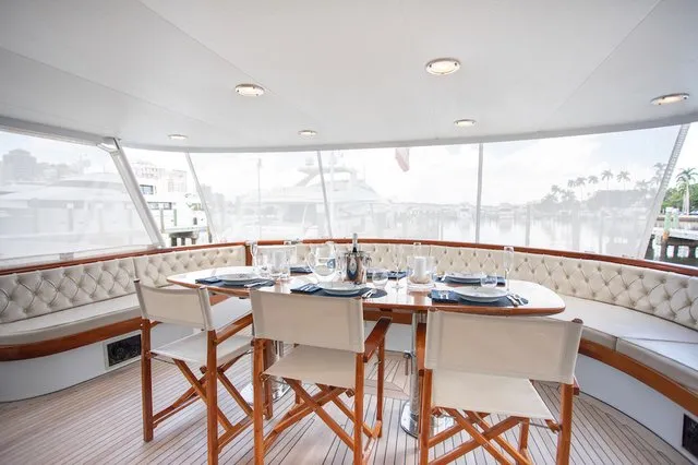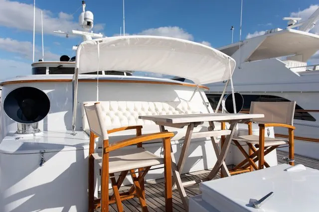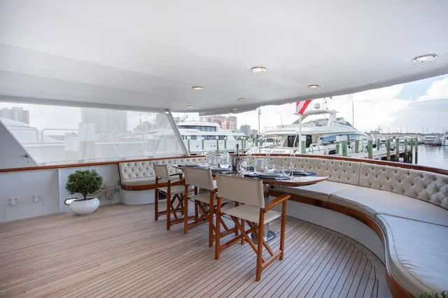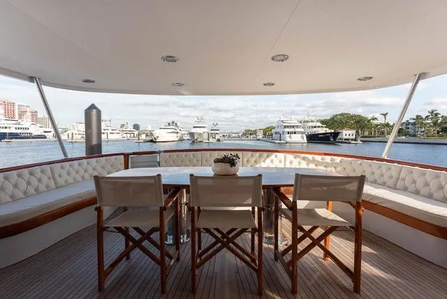 SOVEREIGN’s aft deck features built-in upholstered seating and a twin pedestal large varnished teak table, lending a gracious air to al fresco entertaining and dining. Up on the boat deck is more outdoor relaxation space, with or without shade. Dedicated sun lovers can be found sunbathing on her fore deck, offering complete privacy at sea and when moored in port.