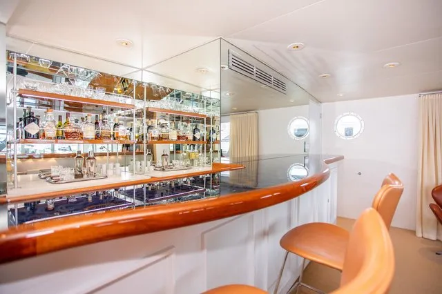SOVEREIGN’s saloon features a large lounge area with comfortable seating and an entertainment center, including a large television screen, while forward is a formal dining area with seating for up to eight guests.