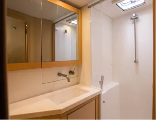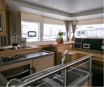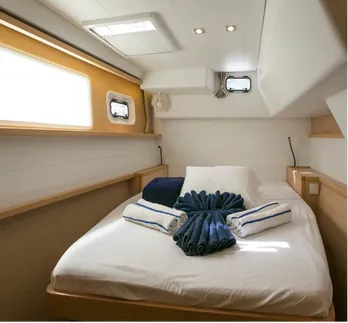 Equipped for comfort, the catamaran includes cockpit cushions, air conditioning, heating, a generator, and a water heater. The deck is well-furnished with a bimini top, a cockpit fridge, an outdoor grill, and a bathing platform with a swimming ladder and shower. The yacht also comes with an electric anchor windlass, a dinghy, and an 80-meter anchor chain.